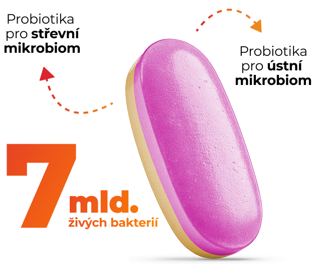 Duální probiotika přinášejí komplexní péči o ústní a střevní mikrobiom. Světlá vrstva tablety obsahuje probiotika pro střeva, která pomáhají udržovat