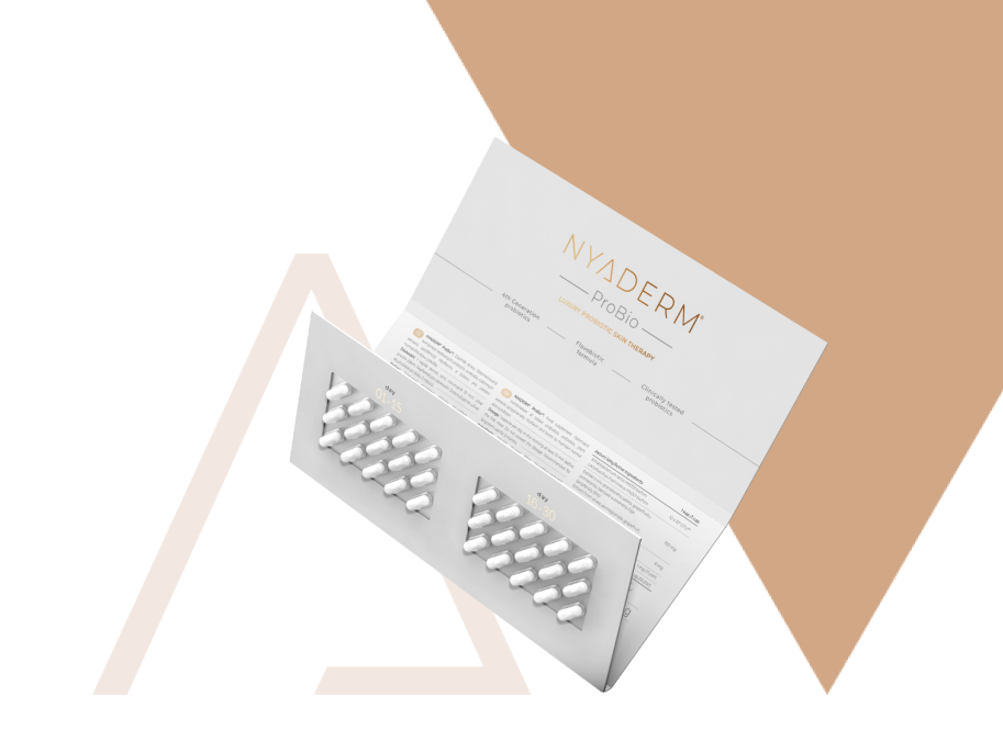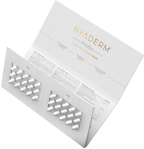 NYADERM® ProBio is a unique dietary supplement containing an optimized combination of clinically tested 4th generation probiotics, prebiotics, flavobiotics, riboflavin and biotin.