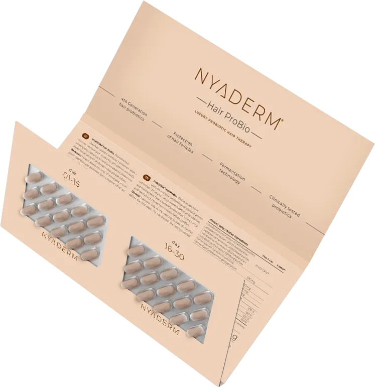 Nyaderm® Hair ProBio is a dietary supplement that comes in the form of vegan-friendly enterosolvent capsules. It contains a unique combination of clinically proven probiotics which reflects the latest scientific findings regarding the relationship between the microbiome and hair – including the beneficial effects of natural substances on the health of the hair shaft.