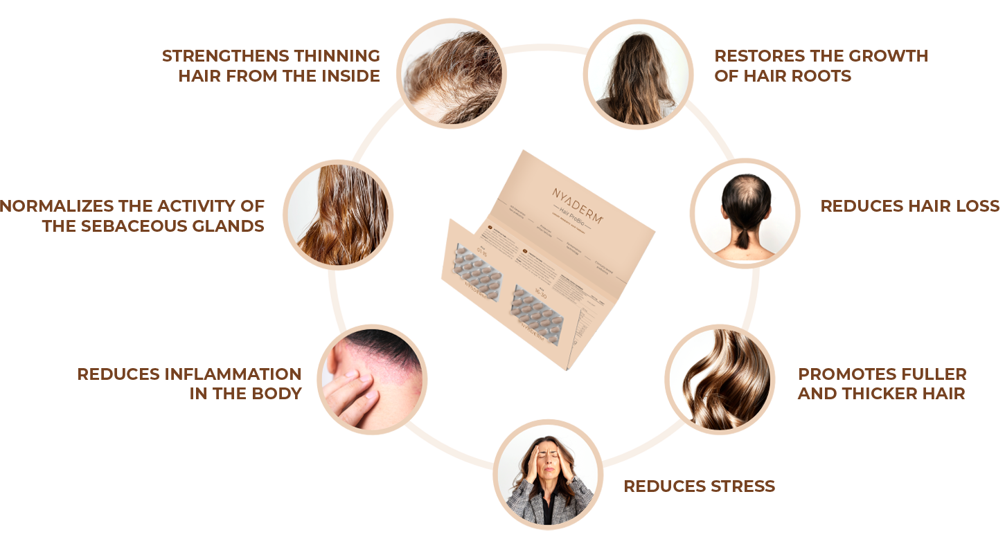 Nyaderm® Hair ProBio brings a revolutionary solution in comprehensive hair care from within, at any age and for both genders. What does the comprehensive dietary supplement solve?