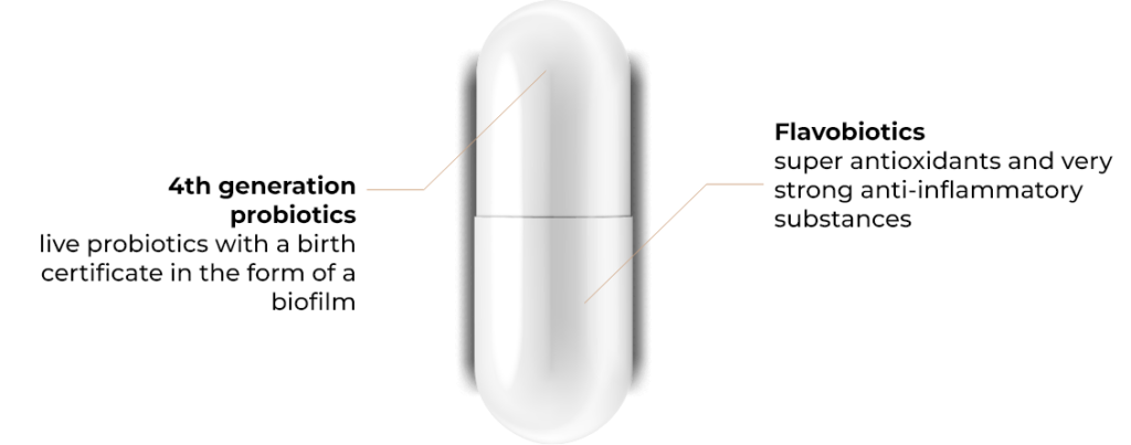 4th generation probiotics bring a pure LIVE bacterial culture in the form of a biofilm, the presence of which is important for the adhesion of bacteria to the intestinal epithelium. Their structure is close to the real state in which they occur on the intestinal mucosa. They have optimized conditions for fast adhesion to the intestinal epithelium, are characterized by higher stability and higher resistance to the acidic pH of the stomach.
